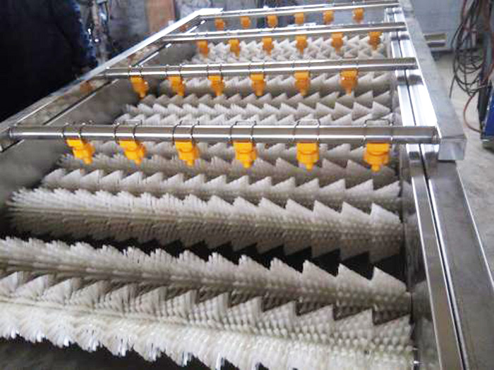 清洗機各毛輥同向轉動,毛刷清洗機實現對物料的翻動,加之噴淋水快速清洗干凈。橢圓形果蔬的刷洗脫皮等工作。主要適用于土豆、紅薯、蘿卜、花生等根莖類物料的清洗及清洗脫皮。刷輥材料經特殊工藝處理,機器全手工植毛避免了機植掉毛的問題,具有清洗、脫皮有效容積大、效率高,節水,毛刷清洗機可連續清洗,操作簡單,使用壽命長等特點,刷輥材料經特殊工藝處理,經久耐用,耐磨性能好。
